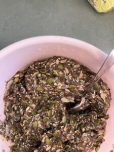 Blanda alla frön ordentligt i en bunke. Lös upp saltet i vattnet och blanda med fröna. Rör tills du får en smet. Bred ut på en plåt med bakplåtspapper.